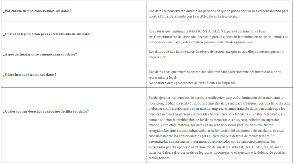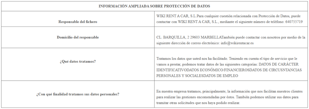 A efectos de lo dispuesto en el Reglamento Europeo de Protección de Datos, WIKI RENT A CAR, S.L., le informa que en determinadas áreas de nuestra Web se solicita al usuario una serie de datos de carácter personal.